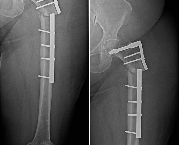 În urma accidentului, pacienta a suferit o fractură de femur proximal, pentru care s-a efectuat inițial o intervenție chirurgicală de osteosinteză prin reducerea fracturii și fixarea acesteia cu o placă metalică de tip DCS (Dynamic Condylar Screw). Alegerea acestui implant a fost influențată de particularitățile cazului, în special obezitatea de gradul III, care a limitat utilizarea unei tije centromedulare la momentul intervenției inițiale.