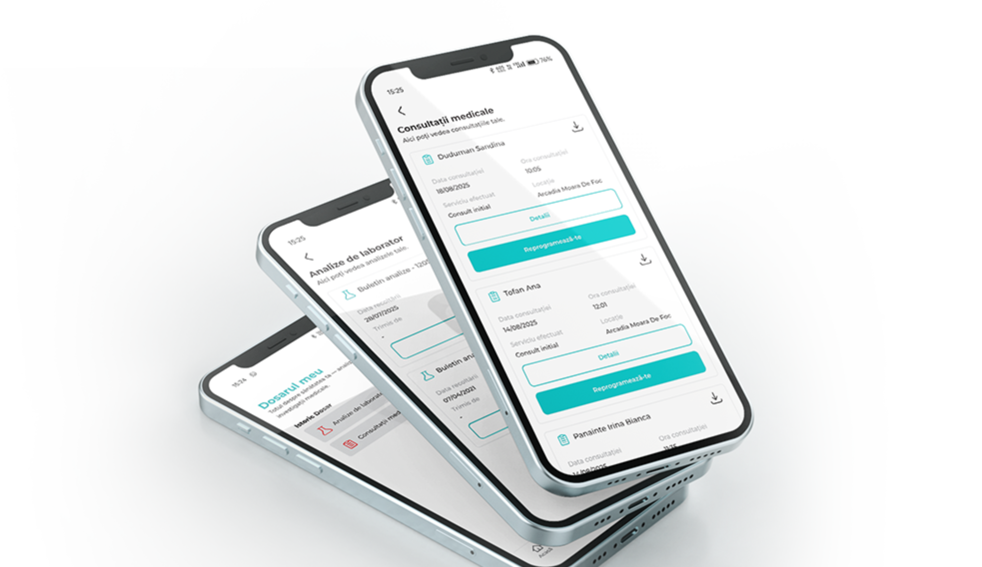 În pagina principală poți vizualiza conținutul dosarului tău medical: istoricul consultațiilor, rezultatele analizelor de laborator, detaliile consultațiilor tale anterioare din Rețeaua Medicală Arcadia, dar și programările viitoare.