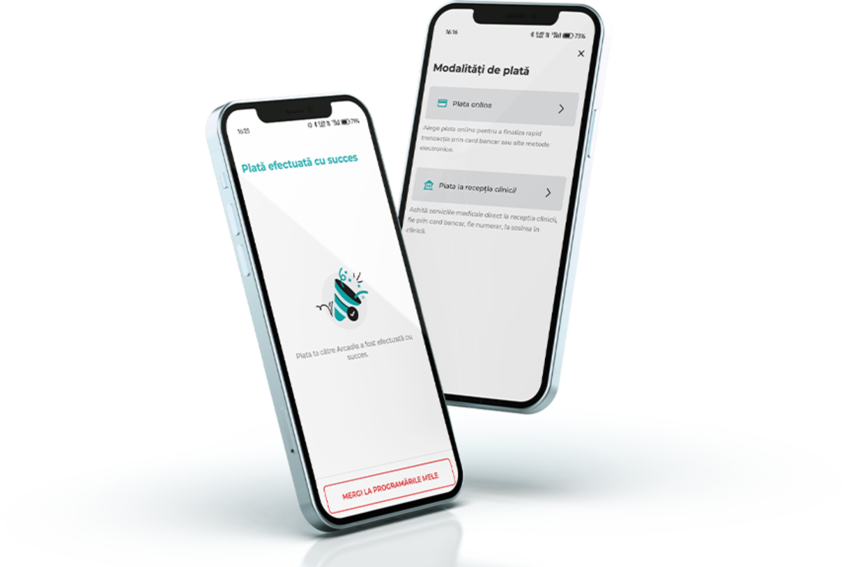 Ai la dispoziție două modalități de plată. Plata online (cu card bancar sau alte metode electronice, prin procesatorul de plăți BT) sau plata la recepția clinicii (plătești la sosire, cu card sau numerar). Pentru programările de telemedicină, plata online este obligatorie. Opțiunea de achitare la recepție nu va fi disponibilă.