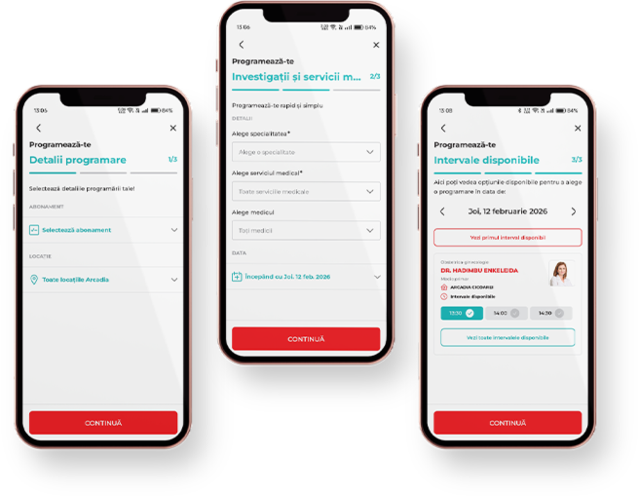 Din pagina principală, selectează butonul „Vreau o programare”. Dacă ai un abonament, selectează abonamentul. Dacă dorești ca serviciul medical să se desfășoare într-un anumit Centru Medical Arcadia, accesează zona „Toate locațiile Arcadia” și selectează centrul sau centrele medicale dorite. În etapa a treia, vei alege specialitatea, serviciul medical și medicul sau medicii. Selectează intervalul orar care ți se potrivește și dacă ai sau nu o recomandare medicală. În ecranul de recapitulare vei putea vizualiza detaliile consultației tale și vei putea alege cum vrei să plătești (online sau la recepție, în momentul în care te prezinți pentru programarea efectuată).